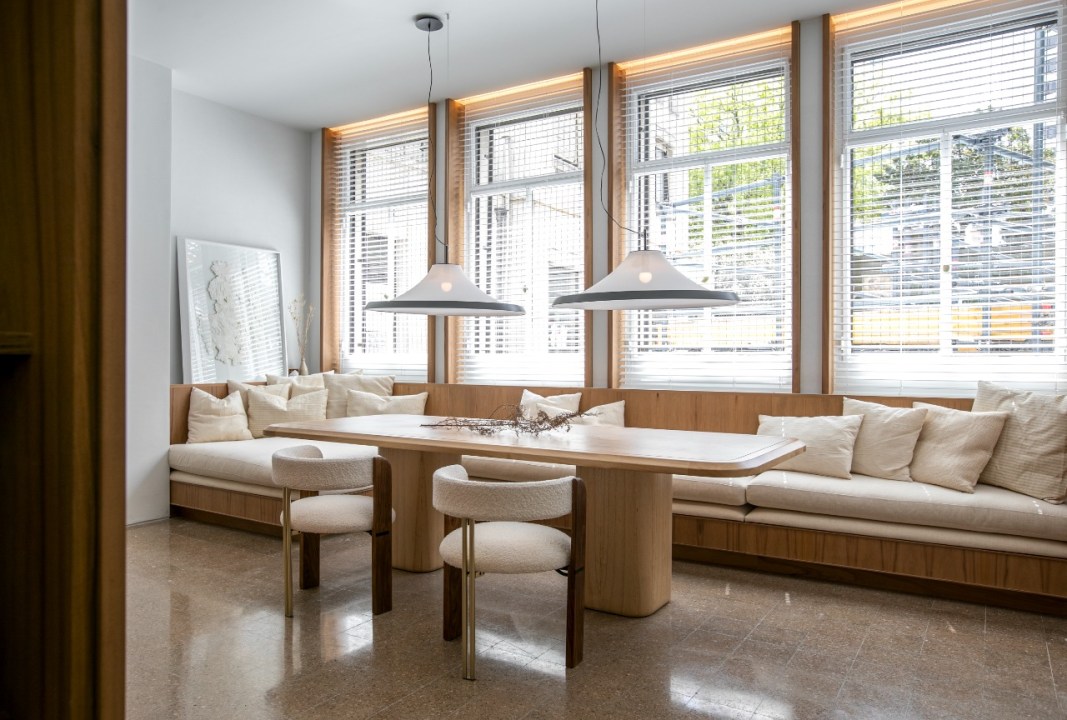 Muros blancos con revoque grueso, piso granítico original del edificio recuperado, maderas cálidas, iluminación indirecta para acentuar la altura del espacio original, así como iluminación puntual y baja, fueron decisiones tomadas para generar espacios íntimos y acogedores.