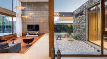 El área social en planta baja es un espacio integrado en doble altura en el que conviven estar, comedor y cocina. Se abre hacia el patio norte en diálogo con una galería que desdibuja los límites entre interior y exterior, asegurando una iluminación controlada en verano y plena en invierno.