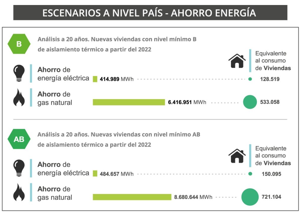 La investigación plantea también escenarios a futuro, previendo cómo sería el impacto de la aislación térmica a 20 años a nivel país, con nuevas viviendas con nivel mínimo B de aislamiento térmico a partir del año 2022, lo cual demostró que: