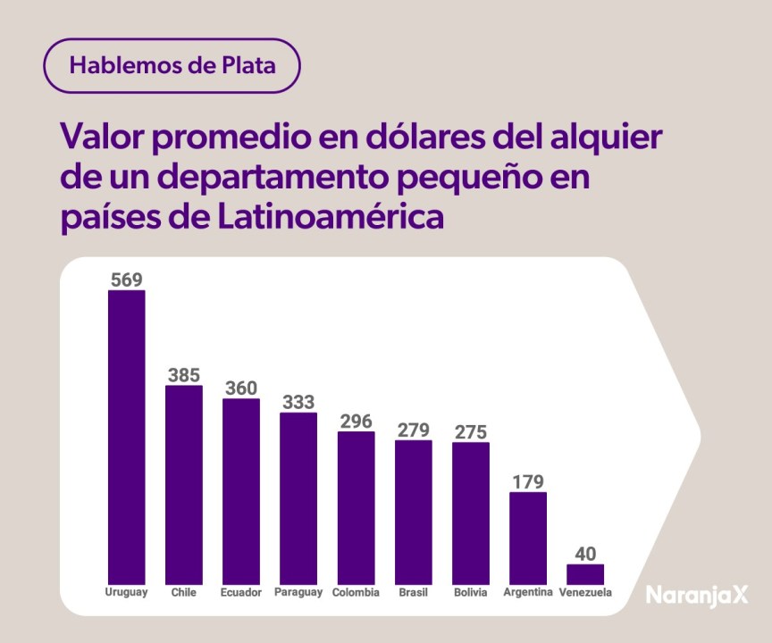 De los países relevados por Focus Market, Uruguay es el país más caro para alquilar un departamento pequeño: se necesitan unos USD 569. Segundo está Chile, donde cuesta alrededor de USD 385, y tercero, Ecuador, con USD 360 aproximadamente. Luego se ubican Paraguay (USD 333), seguido de Colombia (USD 296), Brasil (USD 279) y Bolivia (USD 275).