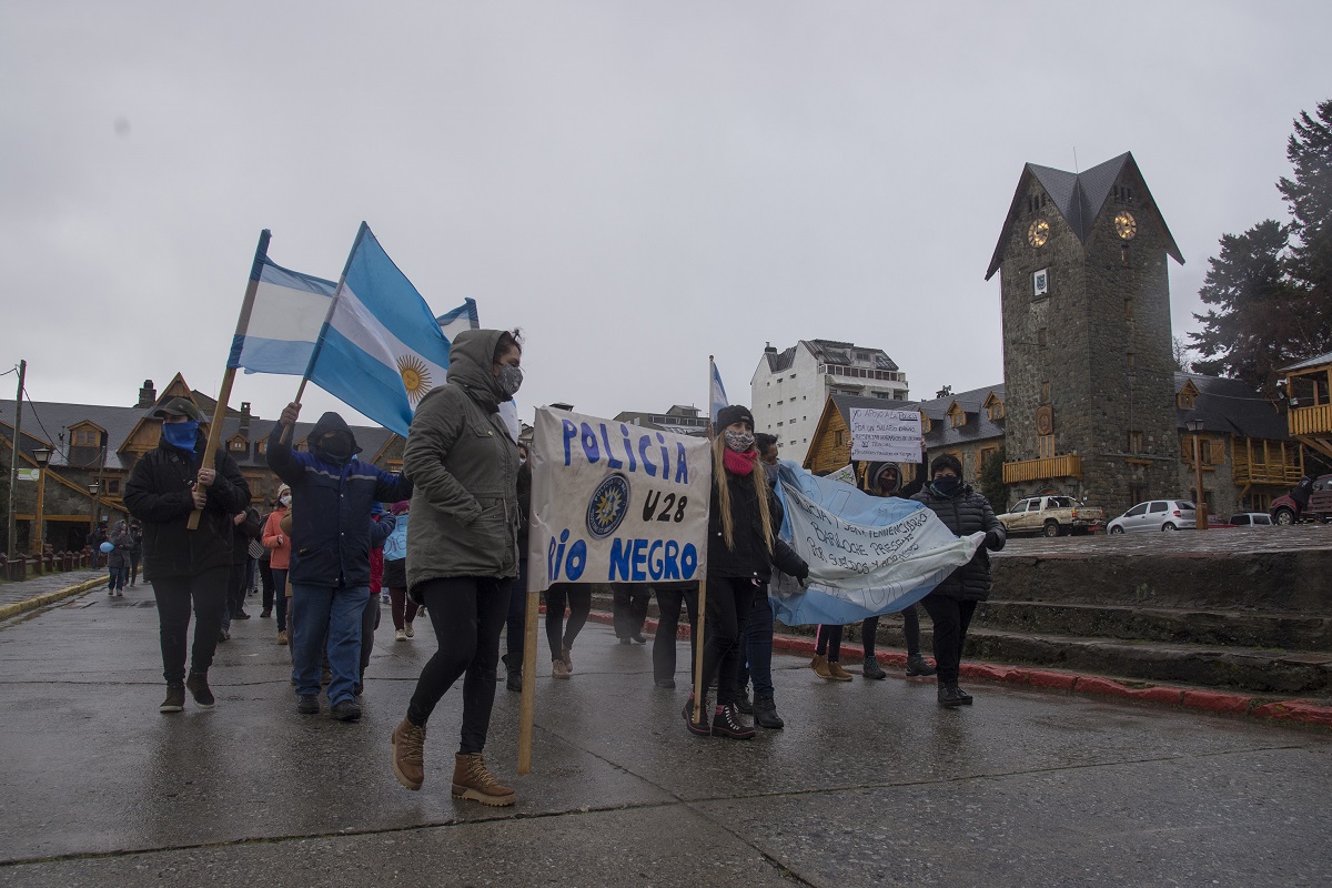 En Bariloche, los familiares de los policías se concentraron en la esquina de Onelli y Moreno desde donde marcharon hasta el Centro Cívico. Dos mujeres encabezaron el reclamo llevando una bandera en la que se leía: «Sueldos y horarios dignos».