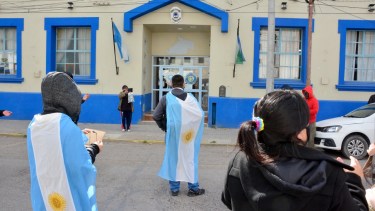 Dieron una vuelta alrededor de la plaza y pese a la lluvia y las bajas temperaturas, permanecieron aplaudiendo y levantando carteles, banderas argentinas y globos de color celeste y blanco.