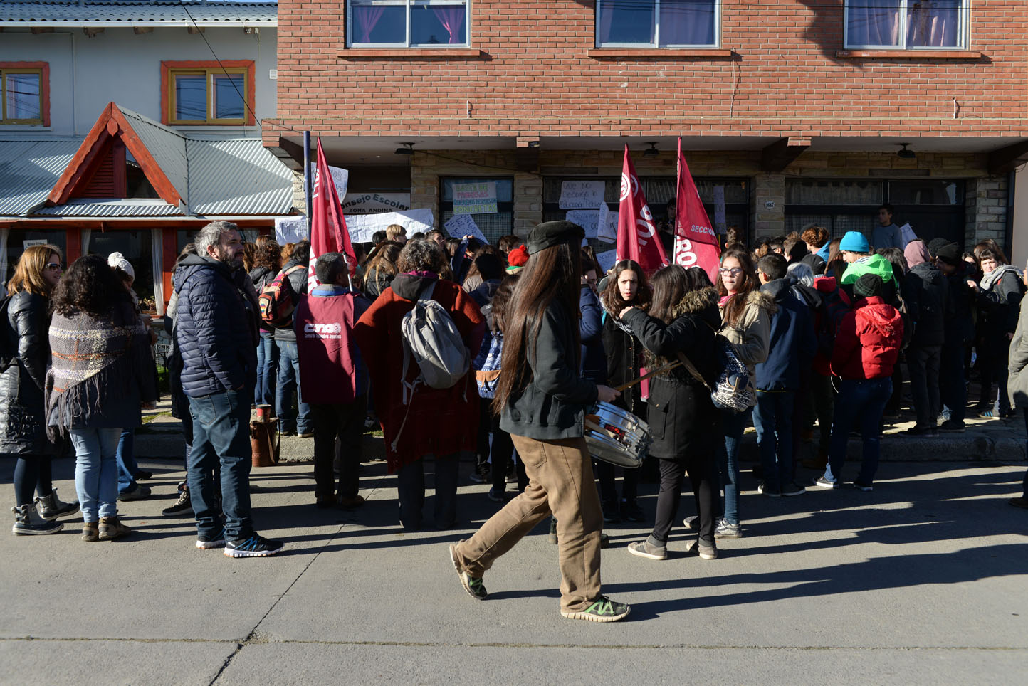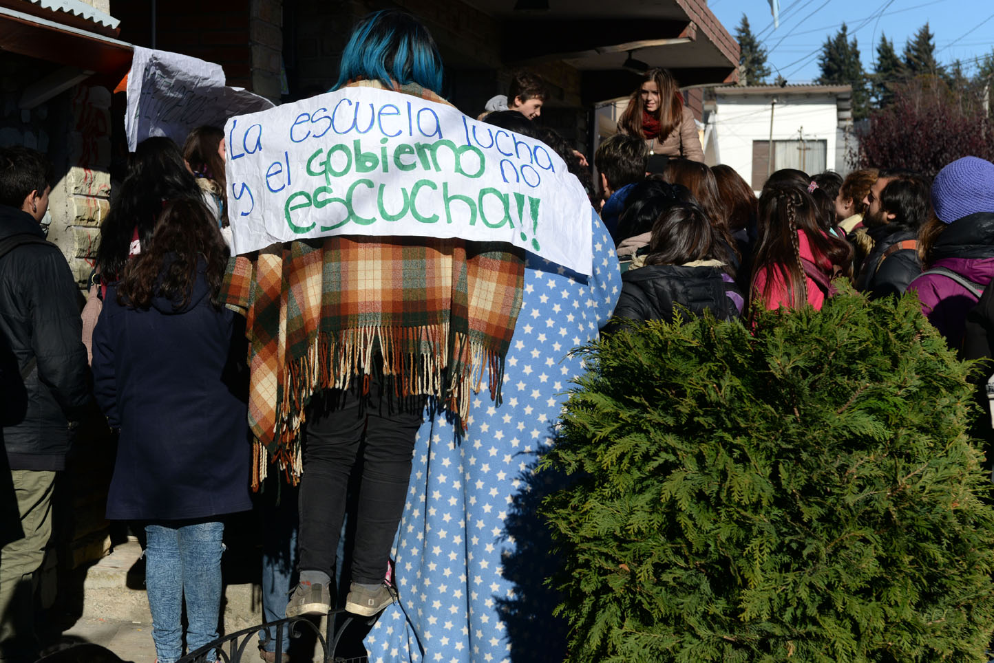 Los estudiantes son acompañados por dirigentes del gremio Unter y de ATE que realiza hoy un paro nacional y decidió sumarse al reclamo “para que los jóvenes puedan estudiar en condiciones dignas”, dijo Úrsula Caracoche, dirigente de ATE Bariloche.
