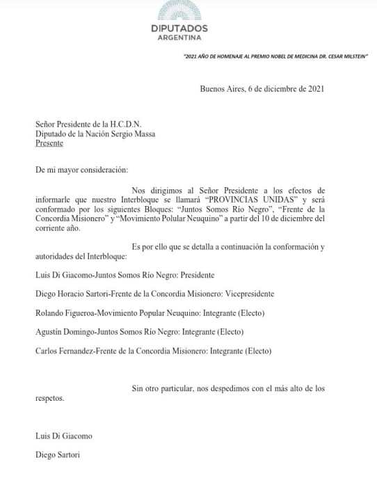 Hoy, luego de haber prestado juramento en la Cámara de Diputados del Congreso de la Nación, llegó una notificación dirigida al Presidente, Sergio Masa la conformación de un interbloque denominado “Provincias Unidas” integrado por Juntos Somos Río Negro, el Movimiento Popular Neuquino y el Frente de la Concordia Misionero”.