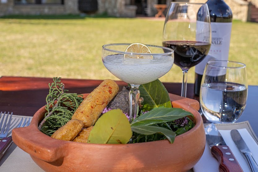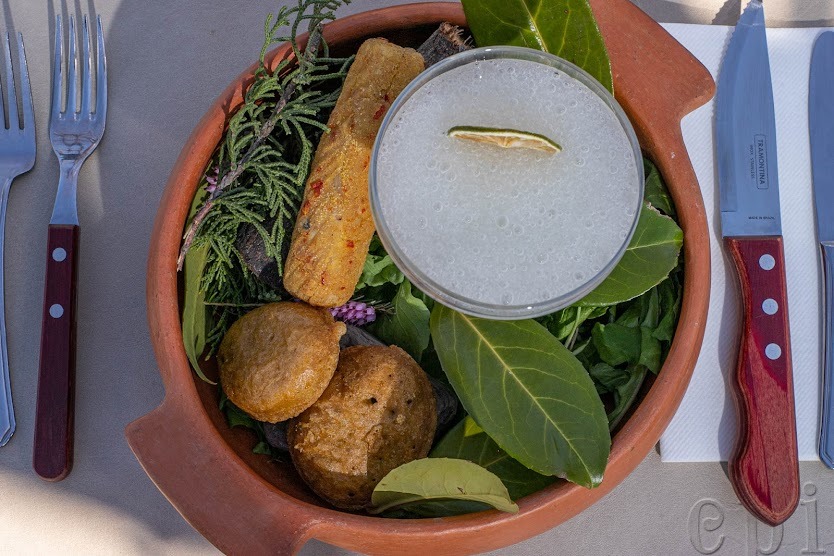 La entrada fueron croquetas y buñuelos a base de flores comestibles, hierbas y tallos de la estepa acompañados con un gimlet (Gin, Cordial de Lima) gelificado a modo de dressing .