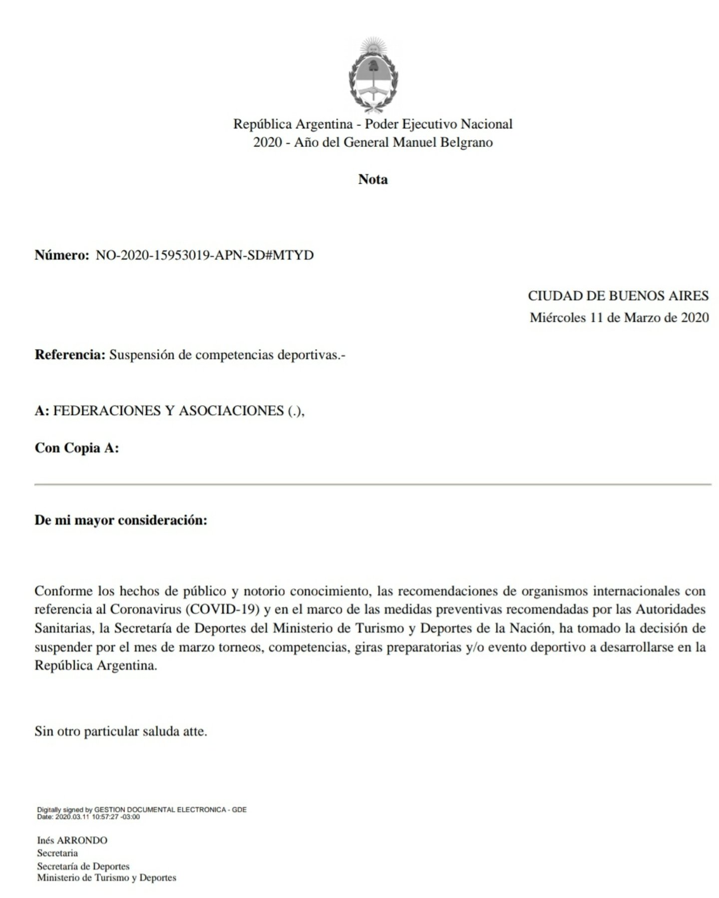 La decisión del estado argentino obedece a las recomendaciones de los organismos internacionales. En principio el comunicado no aclara que se refiere a actividades donde participen deportistas que viajan desde otros continentes o países afectados por la pandemia. Sin embargo, eso se confirmó más tarde y por eso el deporte estrictamente nacional no está incluido en la medida.