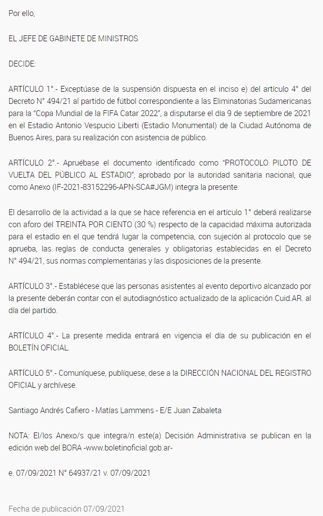 «Exceptúase de la suspensión dispuesta por el Decreto N° 494/21 al partido de fútbol correspondiente a las Eliminatorias Sudamericanas para la “Copa Mundial de la FIFA Catar 2022”, a disputarse el día 9 de septiembre de 2021 en el Estadio Antonio Vespucio Liberti (Estadio Monumental) de la Ciudad Autónoma de Buenos Aires, para su realización con asistencia de público«, indica la norma publicada hoy.
