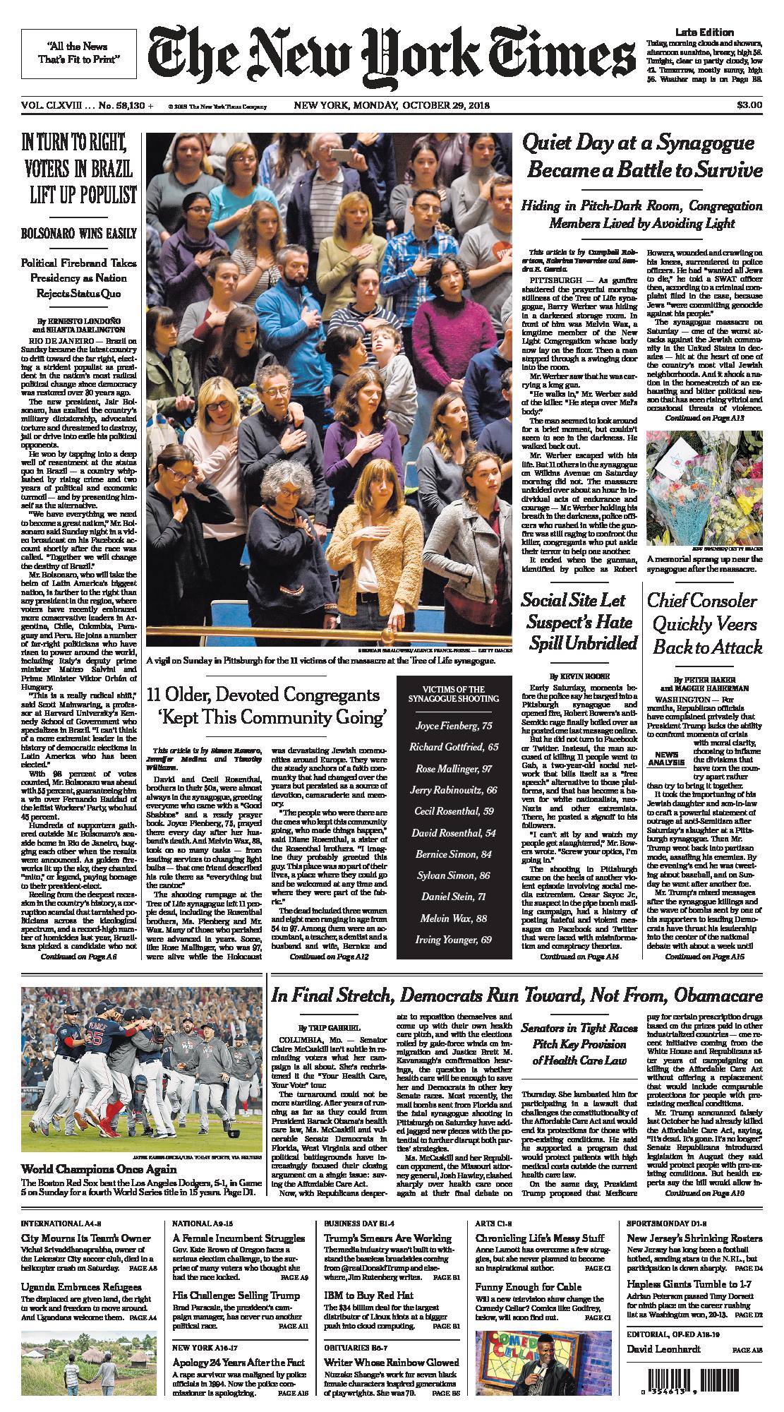 El New York Times le dio una posición destacada en su tapa. El título reza que “Bolsonaro gana fácilmente” y suma que “en un giro a la derecha, los votantes de Brasil alzan al populista”. También resalta que “el agitador político toma la presidencia mientras la nación rechaza el status quo”.