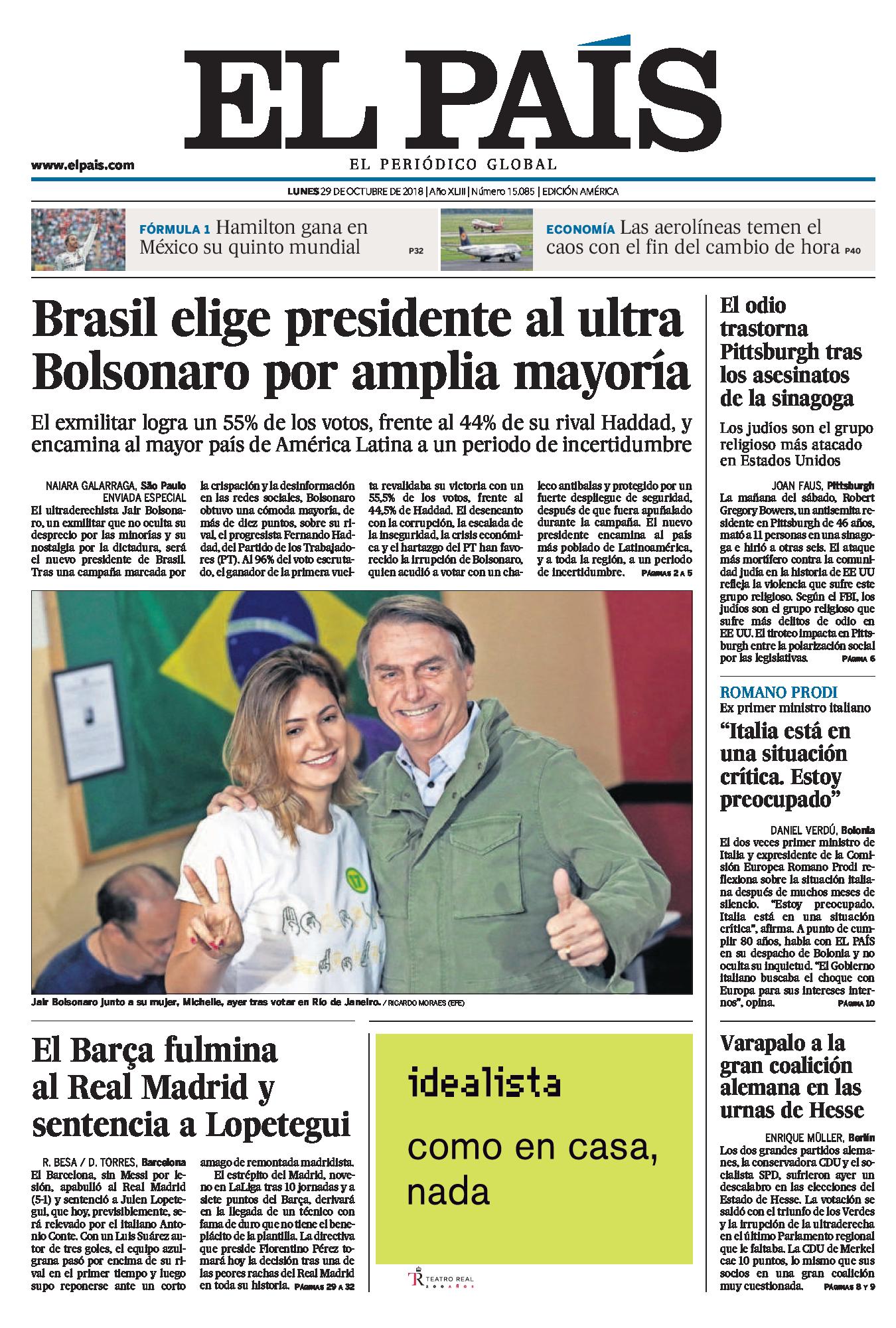 Por su parte, El País afirma en su título principal que “Brasil elige presidente al ultra Bolsonaro por amplia mayoría”, y en su bajada explica que “el exmilitar logra un 55% de los votos, frente al 44% de su rival Haddad, y encamina al mayor país de América Latina a un período de incertidumbre”. Al igual que otros medios, resalta el hecho de que hay un manto de dudas sobre el futuro cercano.