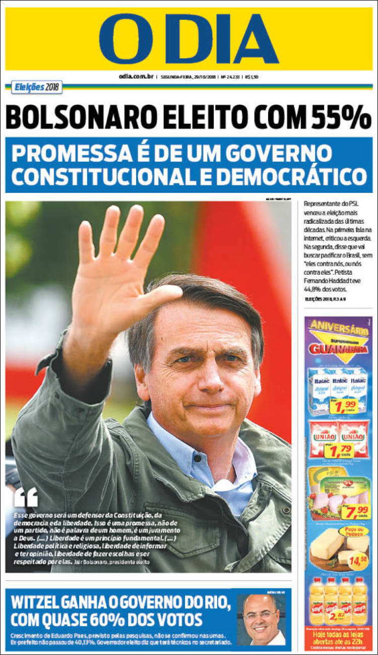Desde el mismísimo Brasil, el diario O Dia titula directamente con un “Bolsonaro electo con 55%”, y destaca que hay una “Promesa de gobierno constitucional y democrático”. En la bajada, explica que “El representante del PSL vence en la elección más radicalizada de las últimas décadas”.