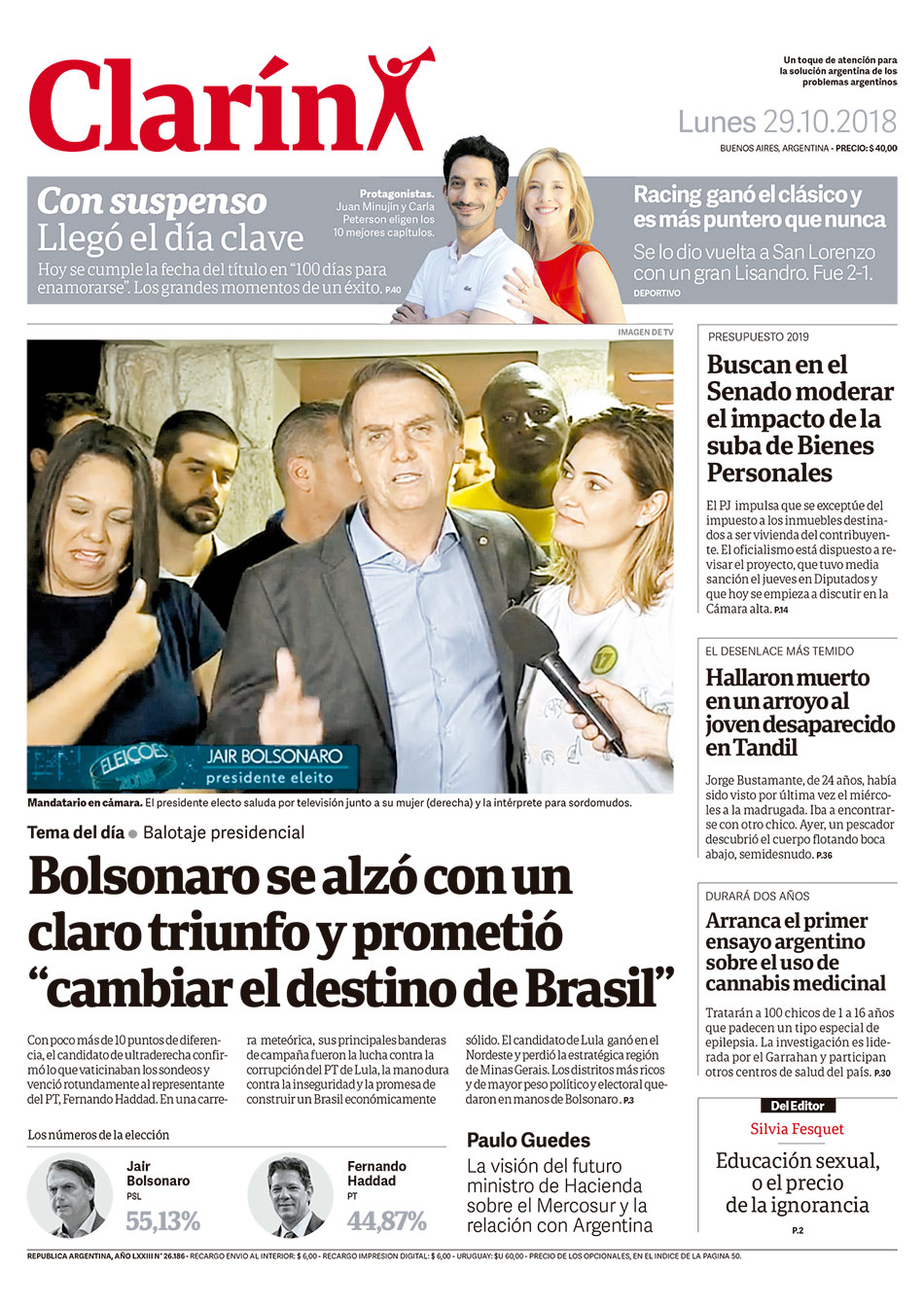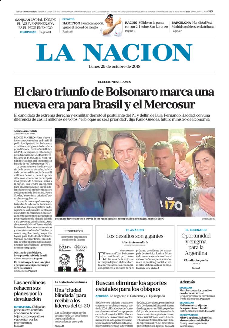 Por su parte, Clarín postuló que “Bolsonaro se alzó con un claro triunfo y prometió ‘cambiar el destino de Brasil’”, mientras que en la bajada explicó que “en una carrera meteórica, sus principales banderas de campaña fueron la lucha contra la corrupción del PT de Lula, la mano dura contra la inseguridad y la promesa de construir un Brasil económicamente sólido”.
