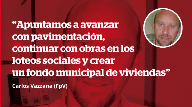 Carlos Antonio Vazzana (57), es el candidato a intendente por el FpV, y cuenta con una vasta trayectoria política dentro del Justicialismo. A nivel municipal fue Director de Deportes, Secretario de Desarrollo Social, Concejal y presidió el legislativo municipal, fue legislador provincial y con José Rayó se desempeñó como Secretario de Gobierno y Coordinación. Es profesor de educación física, profesión que desempeñó en distintas escuela de nivel medio de esta ciudad.