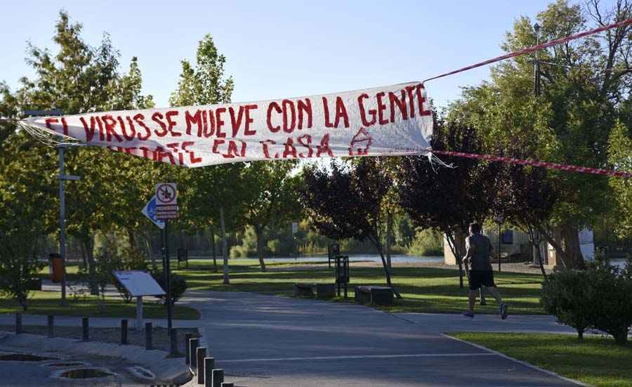 Un cartel en el paseo de la costa invita a la gente a quedarse en su casa Foto: Florencia Salto Poca gente en las calles – Fotos: Florencia Salto Colas con distancia para entrar a los supermercados – Fotos: Florencia SaltoAmor en tiempos de coronavirus – Foto: Florencia SaltoDesinfectan colectivos interurbanos – Fotos: Florencia Salto