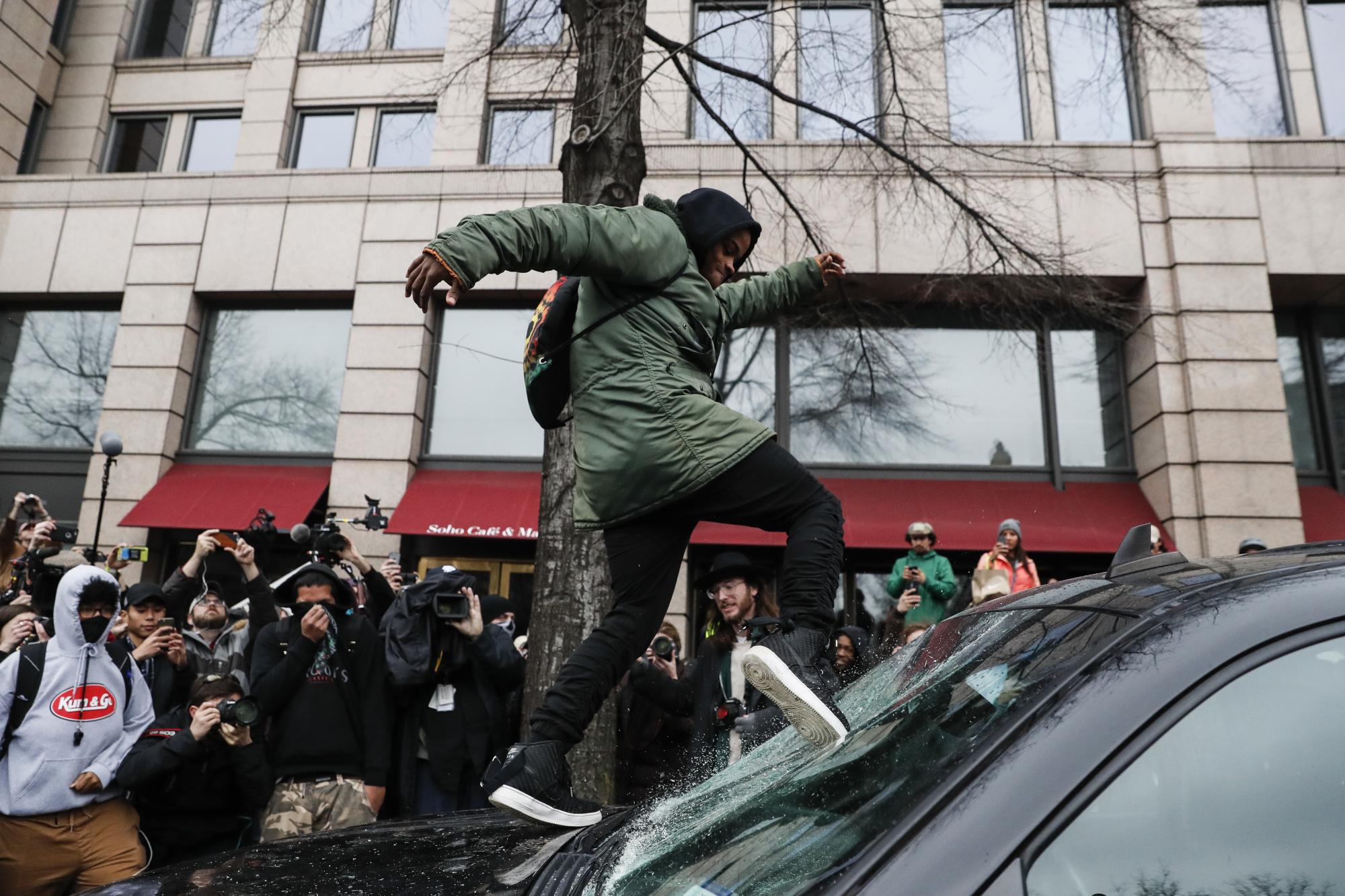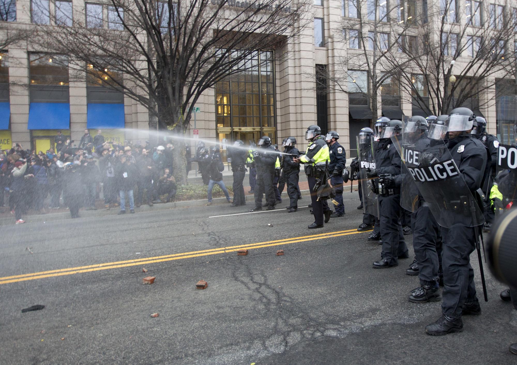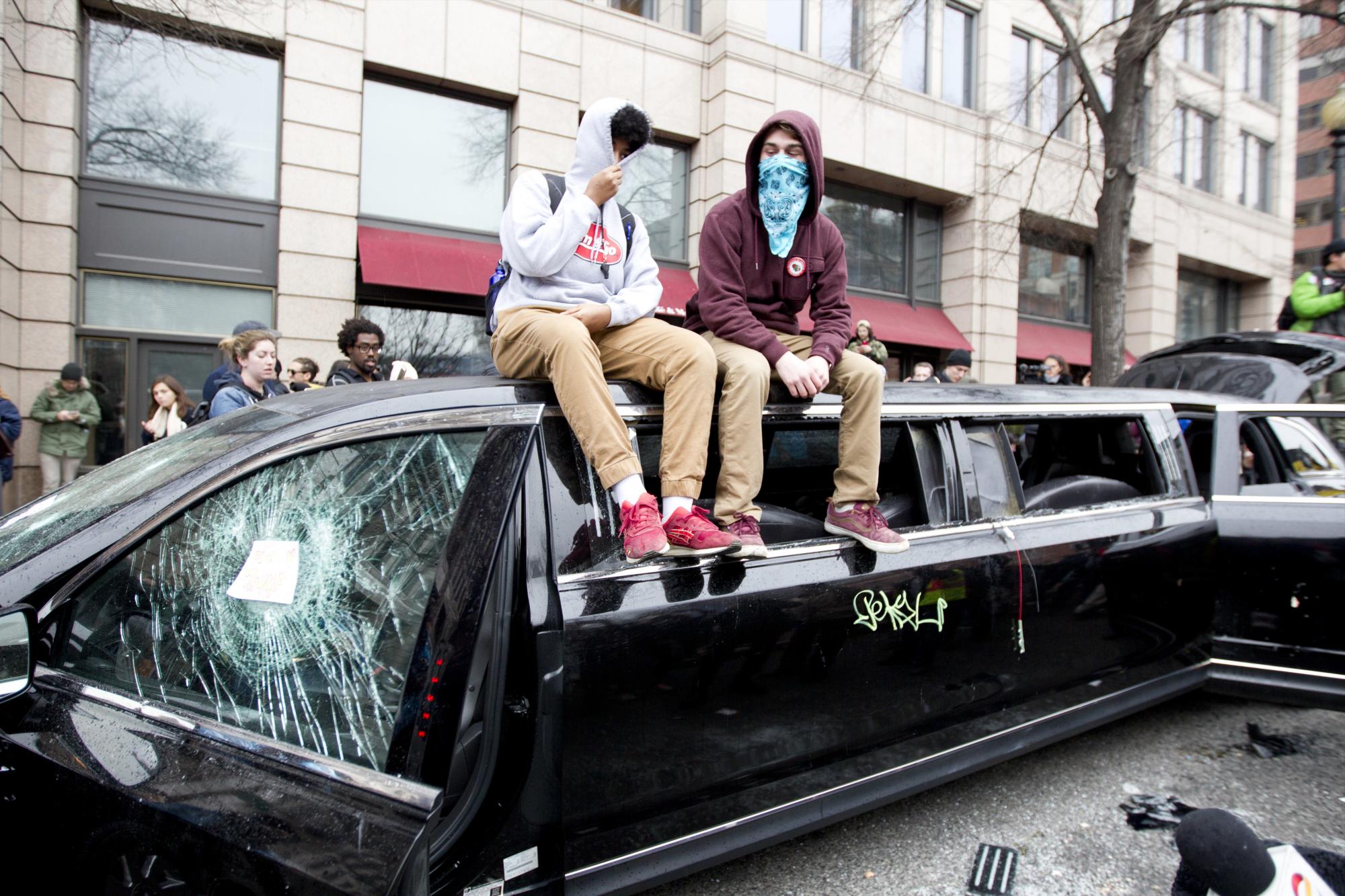 Una nube de humo negro se elevaba desde una limosina negra en la esquina de las calles K y 13 Northwest. La policía antimotines trató de desalojar las personas del área, que se encontraba a sólo unas manzanas de la ruta del desfile inaugural del presidente Donald Trump.