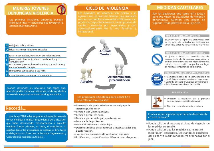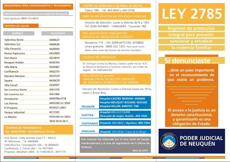 Los Juzgados de Familia, la Oficina de Violencia, la Fiscalía o los Juzgados de Paz son organismos judiciales donde se puede informar un caso de violencia. Sin embargo, también es posible hacerlo en comisarías, centros de salud barriales, hospitales, Servicio 0800-Mujer de la municipalidad de Neuquén, dependencias del Ministerio de Desarrollo Social de la provincia u organismos municipales.