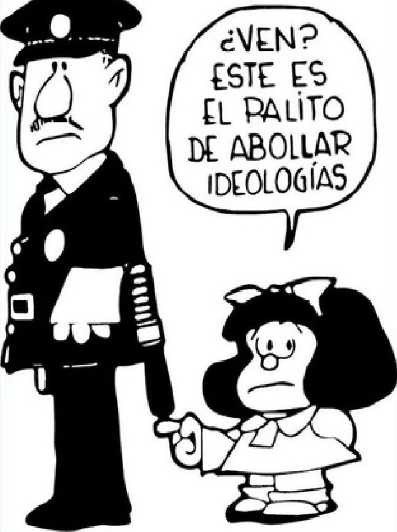 R- Releí toda la serie del vínculo de los personajes con la policía y es muy interesante porque está vinculado a las revueltas de 1969 en Argentina que culminan con el afiche sobre el “palito de abollar ideologías”. Esa composición tuvo enorme importancia política -incluso la sigue teniendo porque sigue estando presente en manifestaciones estudiantiles-. Convocaba, en aquel entonces, cuando fue convertido en afiche, en 1973, a personas con diferentes posiciones políticas -en ocasiones con discrepancias profundas- pero que confluían en su rechazo de la represión, la censura. Con el golpe de Estado de 1976 ese sentido anti-autoritario era parte sustancial del pacto de lectura entre la historieta y sus lectores. Entonces, el acto de leerla durante la dictadura tuvo sentidos políticos: permitía revivir, compartir, una sensibilidad contestataria en la antítesis del proyecto autoritario.