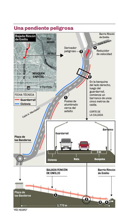 NEUQUÉN.- Un zumbido se siente a lo lejos, el ruido del motor aumenta y de un momento a otro un Peugeot 308 color blanco toma la curva a toda velocidad, a unos 100 kilómetros por hora. A un lado de la calzada, la banquina tiene apenas tres metros, se corta con el guardarraíl y luego abruptamente baja un barranco de unos cinco metros. La calle René Favaloro, más conocida como la bajada del barrio Rincón de Emilio, tiene desde principio a fin 1.770 metros. Comienza a un lado de la plaza de las Banderas con una pendiente recta y prolongada, de casi cinco cuadras, luego viene una curva donde empalma la calle Mandalari que es de tierra y luego le sigue una gran contracurva que permite una visión panorámica de todo Cipolletti. Según las estadísticas que se manejan en la dirección de Tránsito, en los últimos seis años se han realizado en total 34 intervenciones por accidentes y detallaron que el factor común en la mayoría de los casos “son autolesiones, es decir hay un solo automóvil involucrado que viaja a gran velocidad, choca contra el guarda rail o que termina volcando”, indicó el comisario mayor Edgardo Navarrete. Uno de esos accidentes fue fatal. El 5 de septiembre del 2010 a las 21:18 y casi en el acto perdió la vida el conductor del VW Fox, Miguel Quinchavil de 50 años, cuando cayó al vacío. En el mismo siniestro su hijo de 13 y un amigo fueron trasladados de urgencia al hospital Castro Rendón, donde se produjo el segundo deceso, el de Tomás Riveros de 10 años. El testimonio más fiel de la peligrosidad del camino es el de la barrera metálica que contiene a los autos que por un motivo u otro despistan. El guardarraíl está todo abollado e inclinado por los impactos. La calle también muestra algunos indicios con frenadas, partes plásticas de los vehículos accidentados y vidrios molidos. El tramo final del circuito es también muy peligroso. Al llegar al punto de ingreso a Rincón de Emilio hay un triángulo tipo plazoleta que bifurca el camino. Para quienes entran al barrio hay un giro hacia la derecha con un trayecto empinado y serpenteante de 100 metros, que a la mitad tiene reductores de velocidad de plástico. Para quienes salen del barrio, la historia es otra. La mano que sube no tiene banquina desde que comienza la calle hasta el cruce con Mandalari, y luego la calzada continúa sin margen de emergencia hasta llegar a la cima de la barda. Son apenas unos centímetros los que separan el asfalto del guardarraíl y de una senda peatonal de cemento con decenas de postes de alumbrado público. Otro factor de riesgo para la bajada al barrio Rincón de Emilio es la presencia de vecinos practicando deportes en la barda. (Ver destacado)