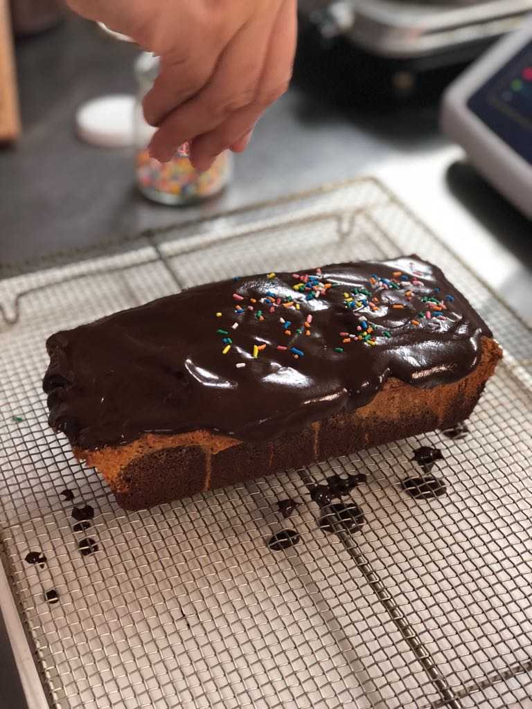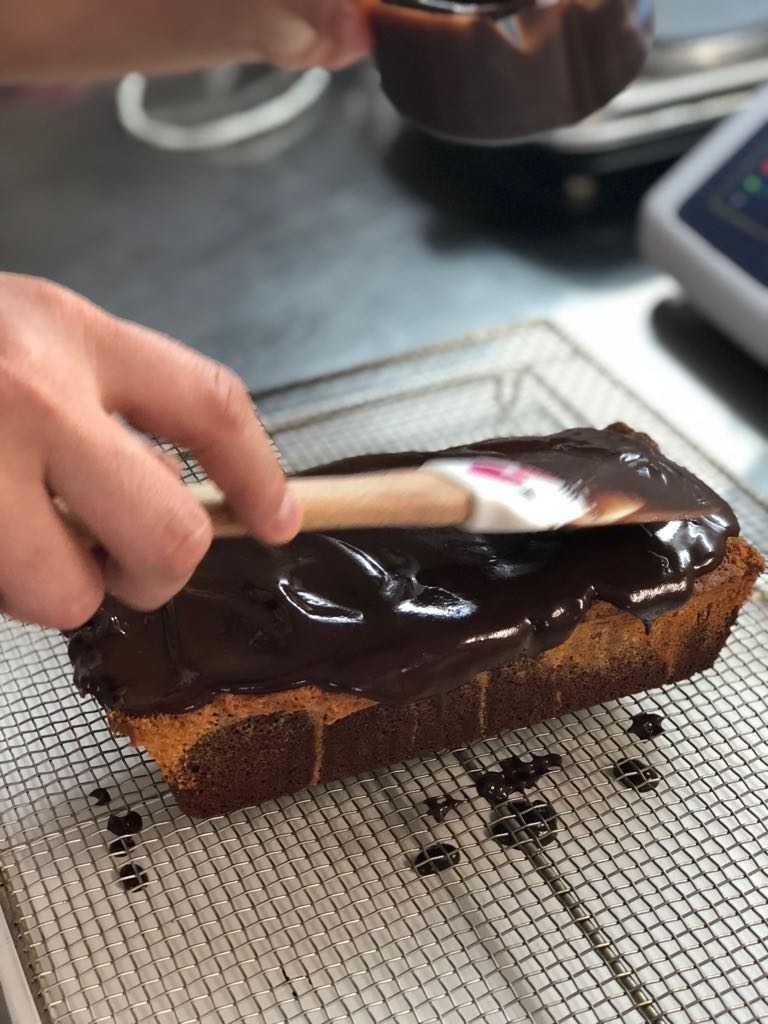 Para el baño de chocolate hacer una ganache con 100 grs de chocolate semi amargo y 100 grs de crema de leche. Hervir la crema y una vez que hirvió volcarla sobre el choco picado. Esperar unos minutos y revolver bien hasta que no queden grumitos de chocolate. Debe quedar como una salsa. Bañar el budín y dejar enfriar. Consumir dentro de los 4 días.