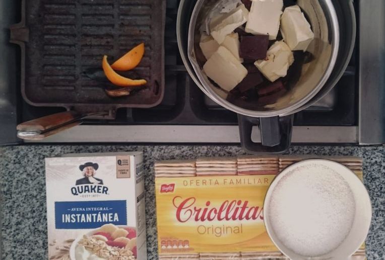 Se mezclan a baño María el chocolate y la manteca, hasta que estén completamente derretidos, se le agregan el azúcar y el quaker hasta obtener una pasta homogénea (aquí puede agregarse dulce de leche o leche condensada si quieren, hace la mezcla más adherente y dulce). Retirar del baño María.