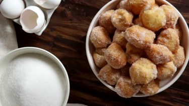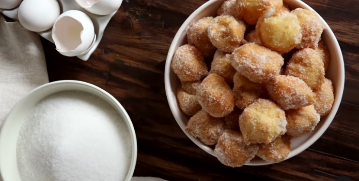 Paso siguiente se colocar el aceite para freír en una olla y se lleva a hervor. Se toma una porción de masa con un cuchara y se fríe. El buñuelo debe dorarse de ambos lados para una cocción pareja. A medida que están listos se sacan y se van cubriendo con azúcar. El próximo paso es disfrutarlos.