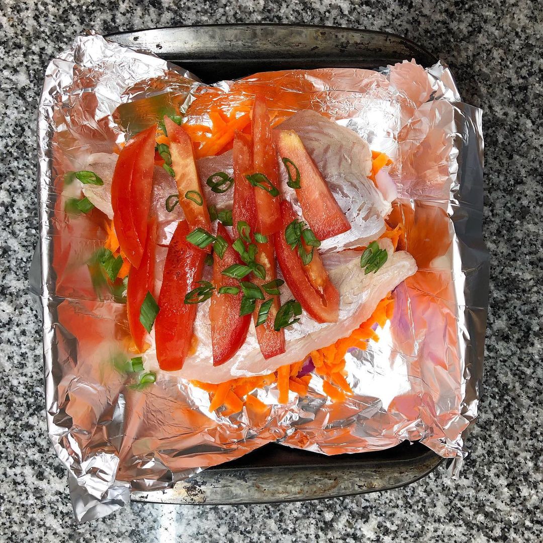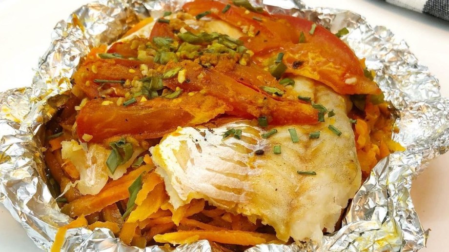 En una fuente poner el papel metalizado ordenar los ingredientes de la siguiente forma: cebolla y cebollitas de verdeo, zanahoria, filet de merluza, tomate, intercalar condimentos. Cerrar el papel metalizado y llevar al horno hasta que el filet quede bien cocido.