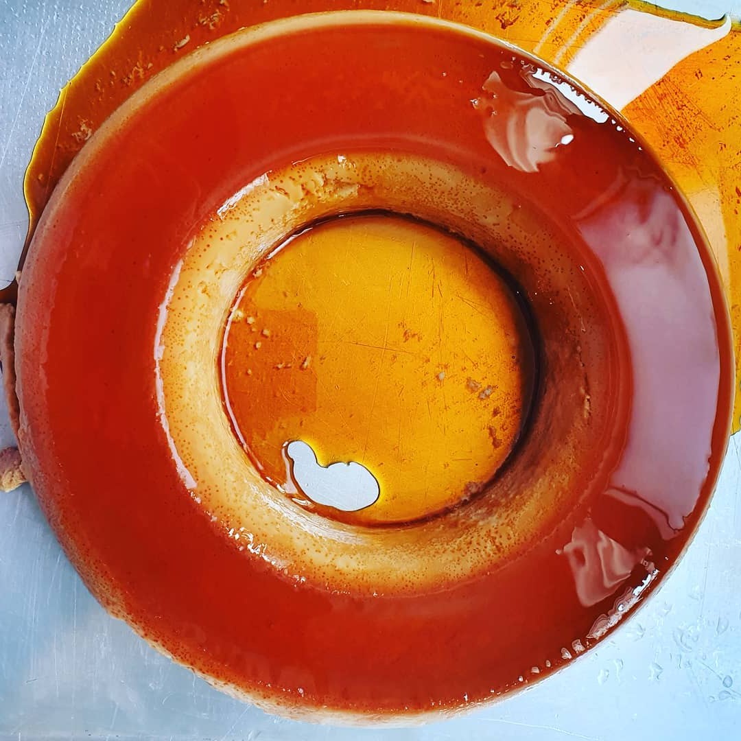 Atención: tener cuidado con las salpicaduras que produce; hacerlo con suma precaución. Verter el caramelo en un molde metálico o de vidrio térmico grande o en varios individuales y hacerlo correr para cubrir todo el interior. Reservar.