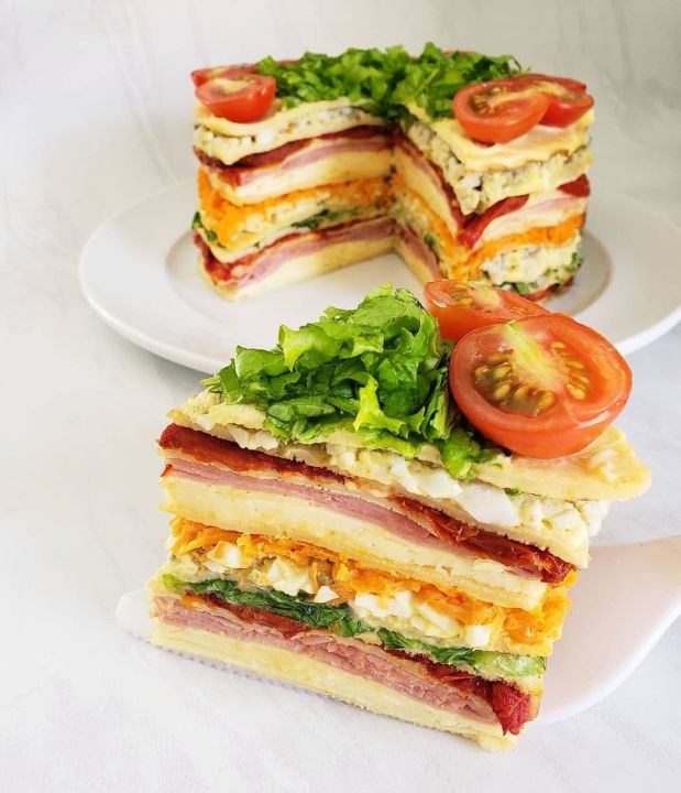 Colocar un panqueque de base, untarlo con mayonesa y agregar jamón y queso. Por encima colocar otro panqueque (es muy importante ir aplastando la torre desde el centro hacia afuera para que se mantenga recta), untarlo con mayonesa y agregar los tomates secos previamente hidratados en agua caliente. Agregar otro panqueque, volver a aplastar la torre desde el centro hacia afuera, untar con mayonesa y agregar el relleno. Repetir este procedimiento en todas las capas. La terminé con un poco de mayonesa, tomates cherrys y lechuga. Guardarla en la heladera con papel film para que no se seque.