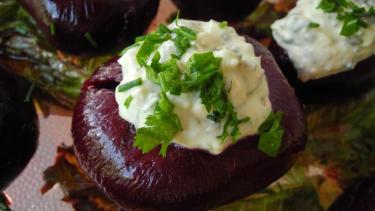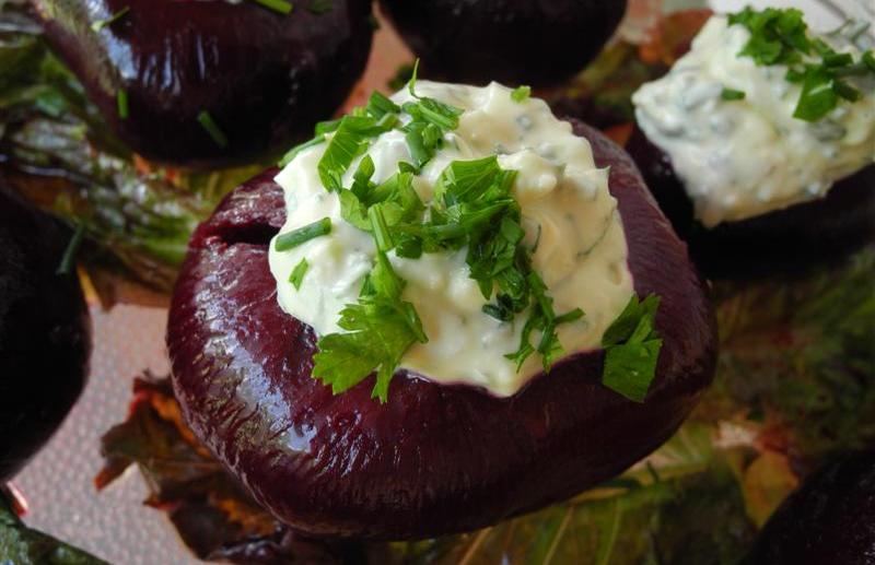Limpiar, pelar y hervir las remolachas. Cortarles la base y ahuecar. En una sartén con aceite de oliva, dorar la cebolla picada. Salpimentar. En un bol mezclar yemas de huevo duro pisadas, queso untable, nuez moscada, sal, pimienta, perejil picado y las cebollas rehogadas. Rellenar las remolachas antes de llevar a la mesa.
