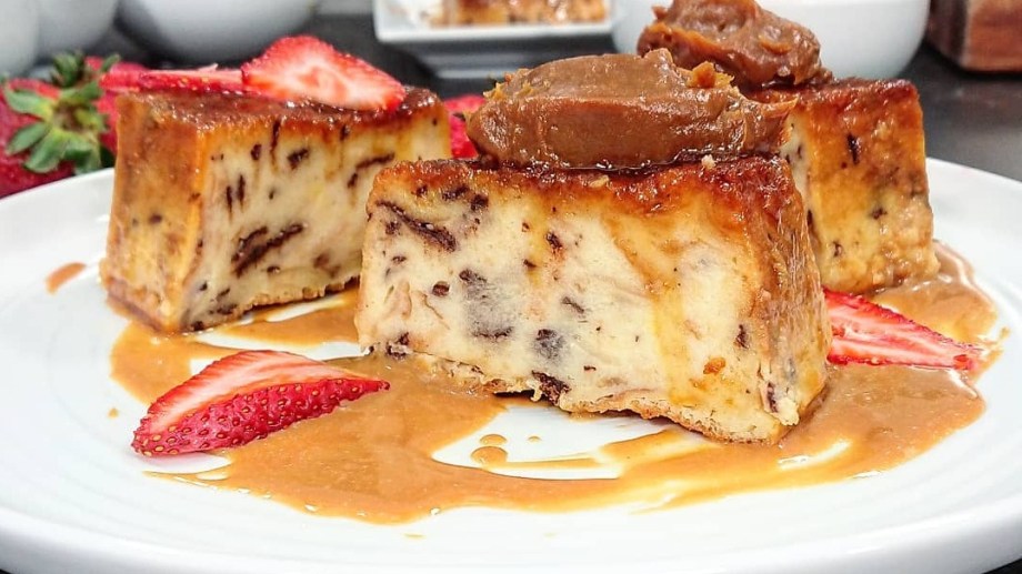 Romper el pan con las medialunas e hidratar en leche, crema y huevo.