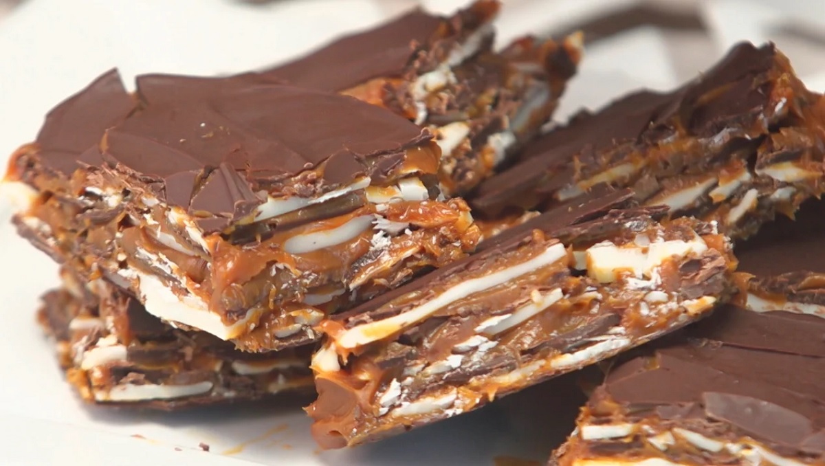Hacer una capa finita de chocolate sobre el molde, llevar a la heladera por 5 minutos para solidificar. Retirar de la heladera, repartir por encima del chocolate una capa de dulce de leche finita, luego otra capa de chocolate por encima, y llevar nuevamente a la heladera por 5 minutos. Repetir estos pasos hasta terminar el chocolate (la última capa debe ser de chocolate). Llevar a la heladera por 2 horas y luego cortar en cuadraditos.