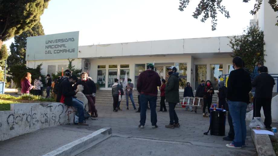 Estudiantes se reunieron en el playón de la sede de la Universidad Nacional del Comahue en Neuquén para reclamar que las autoridades universitarias brinden "más políticas de bienestar". Insisten en que no se están pagando las becas y que el reparto de módulos alimentarios no basta para sortear las dificultades económicas que atraviesan los alumnos en el contexto de pandemia.