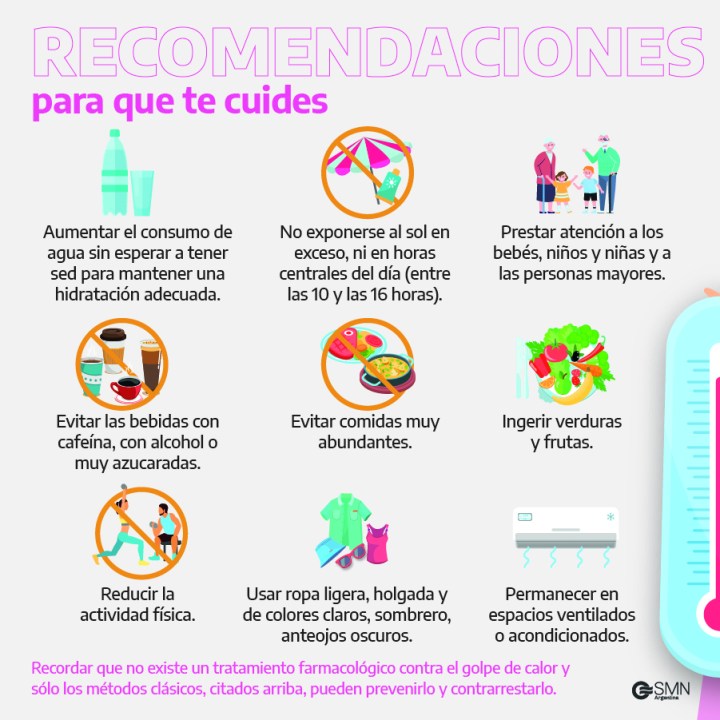 Las altas temperaturas ponen en riesgo la salud de las personas, especialmente de los mayores de 60 años y de los bebés y niños. Los períodos de altas temperaturas pueden provocar un golpe de calor, caracterizado por fuerte dolor de cabeza, pérdida de la conciencia, aumento extremo de la temperatura corporal, mareo y sequedad en la piel, advierte el SMN.
