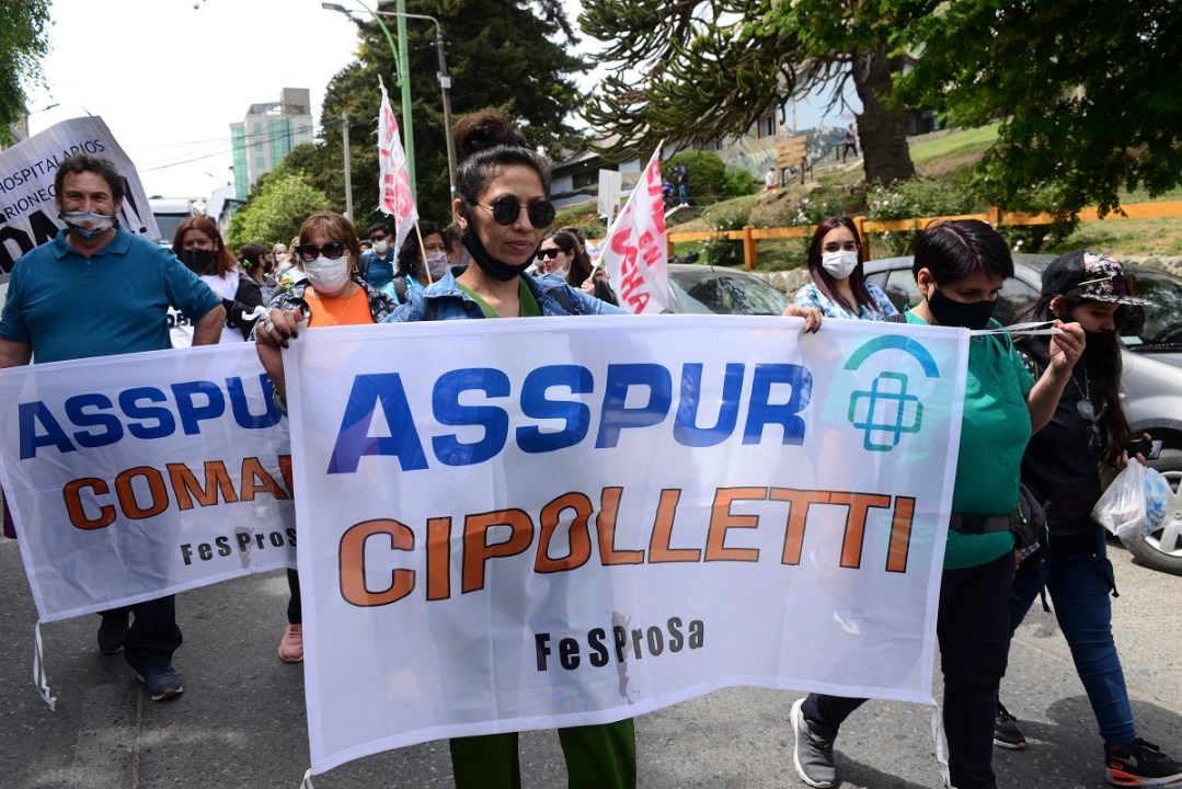 Los trabajadores de distintos hospitales de la provincia nucleados en la Asociación Sindical de Salud Pública de Río Negro (Asspur) se manifestaron este mediodía en Bariloche para reclamar a la gobernadora Arabela Carreras el reconocimiento gremial de su sector, la inclusión en la discusión paritaria y un aumento salarial para que los sueldos superen la canasta familiar.