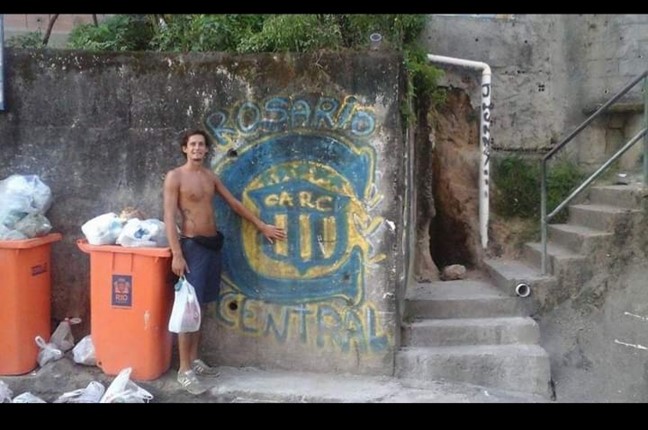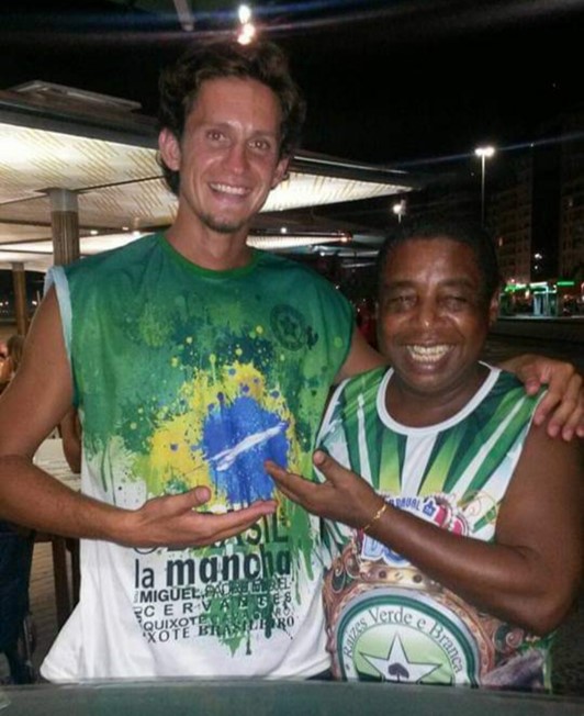Con el hermano de Jairzinho, número 7 de la selección de Brasil que jugó con Pelé. Luego de año nuevo encontré trabajo en un barcito en Copacabana, Río de Janeiro, y este señor siempre me hacía chistes con Maradona y Pelé, hasta que me cuenta su historia y en el medio de mi trabajo se saca la remera de su Escuela do Samba y me la regala. Yo me saco la mía pero no me la acepta (entendible ya que era una lisa sin nada memorable). Enero 2016.