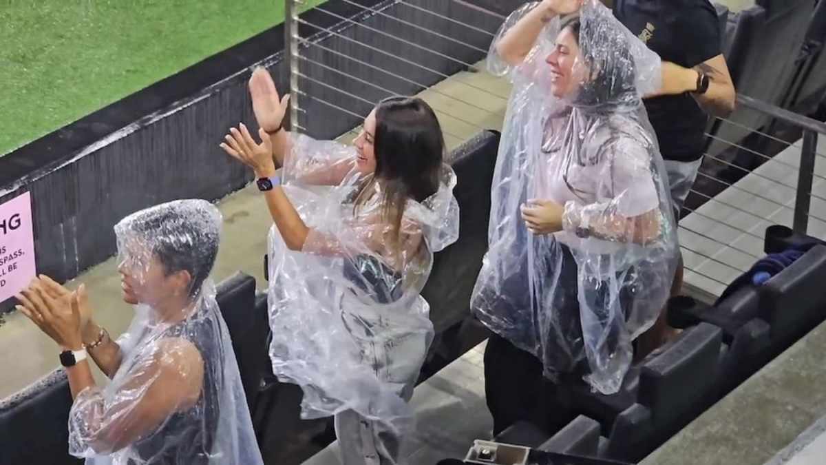A pesar de la intensa lluvia que acompañó el partido, Antonela Roccuzzo se mantuvo firme en la tribuna, alentando a los jóvenes jugadores.