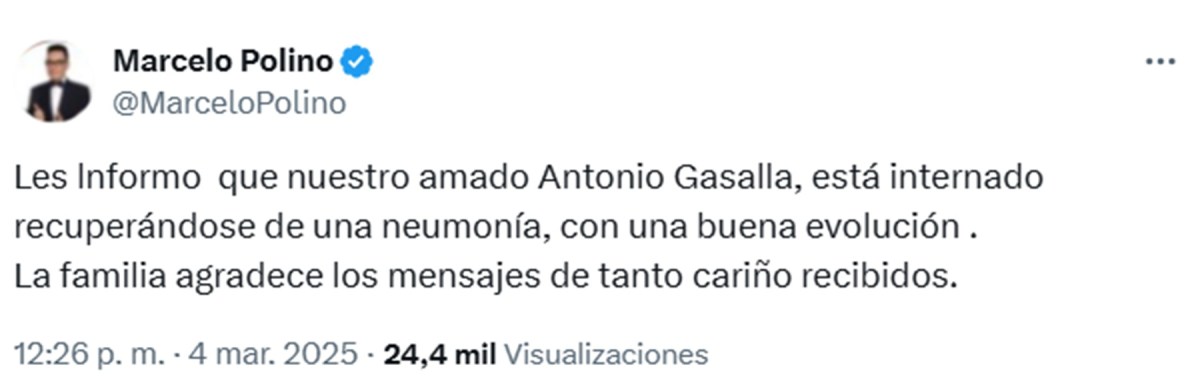 «Les informo que nuestro amado Antonio Gasalla está internado recuperándose de una neumonía, con una buena evolución. La familia agradece los mensajes de tanto cariño recibidos» indicó el periodista sobre la salud del actor.
