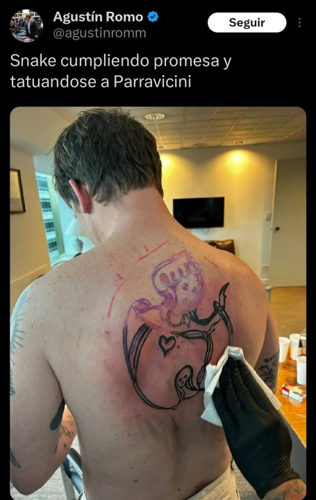 El detalle que Santiago Caputo habría decidido tatuarse en su espalda fue dado a conocer por el diputado bonaerense Agustín Romo, referente de La Libertad Avanza. En su cuenta de X, el legislador publicó esta versión del «hombre gris» con la leyenda «Snake cumpliendo su promesa y tatuándose a Parravicini».