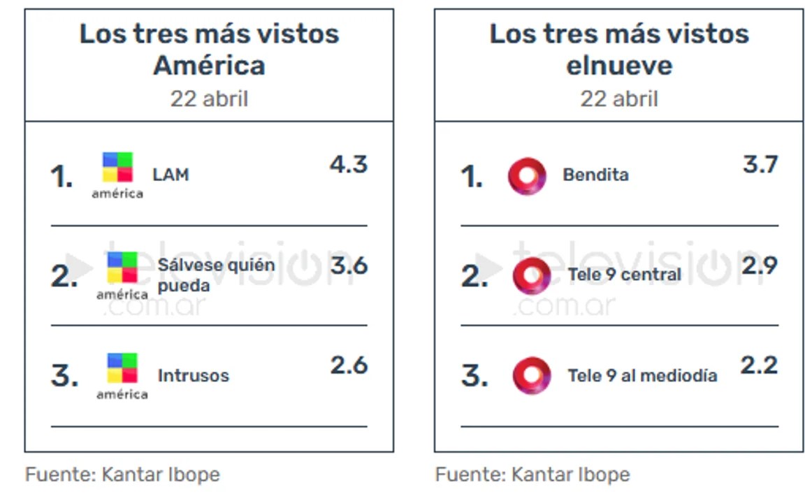 Por el lado de América siguen dominando los programas de espectáculos, de hecho tres ciclos con esta temática se quedaron con todo el podio de la señal de Daniel Vila. Primero, también lejos, quedó LAM con una media de 4.3.
