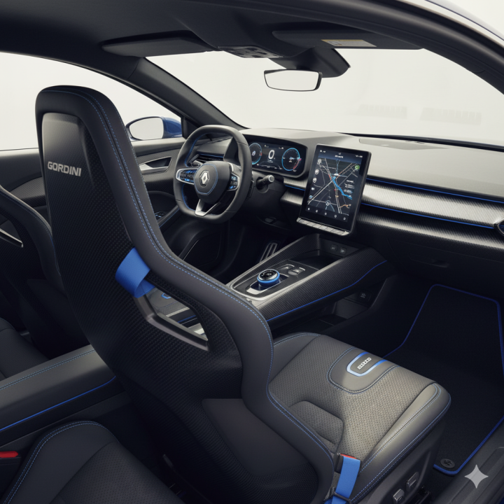 - Materiales: Se combinarían materiales de alta calidad como fibra de carbono, aluminio cepillado y alcántara. Los detalles en azul Gordini estarían presentes en los cinturones de seguridad, la iluminación ambiental y las costuras.