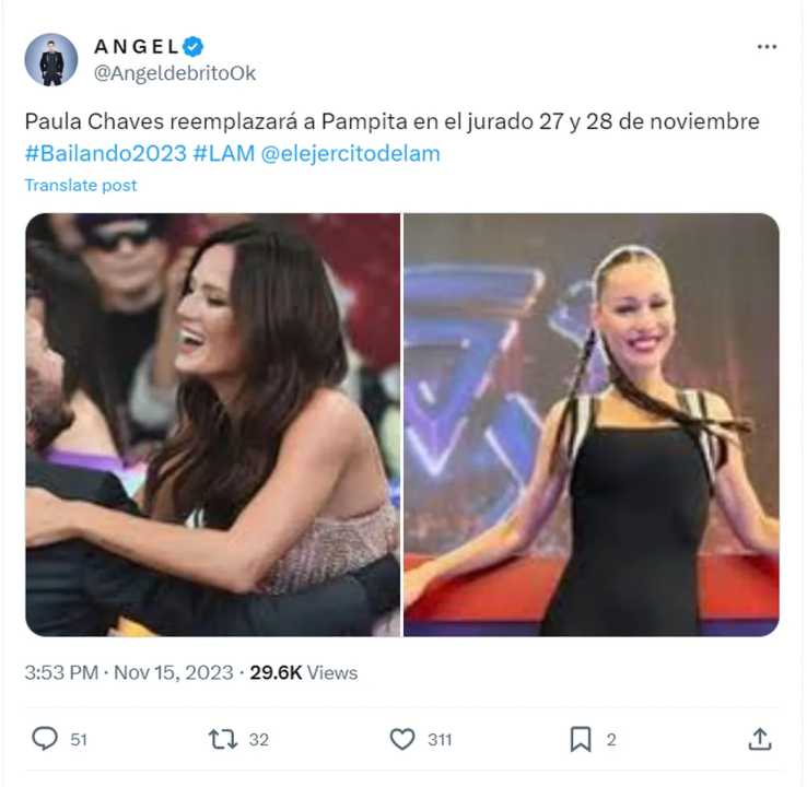 «Paula Chaves reemplazará a Pampita el 27 y 28 de noviembre», escribió el periodista en su cuenta de Twitter. Además, adelantó, que el programa de Marcelo Tinelli terminará el 31 de enero de 2024.