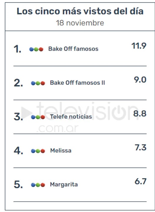 Bake Off Famosos volvió a ser lo más visto de la televisión abierta este lunes 18 de noviembre. El reality de cocina le sigue dando buenos dividendos al canal de las pelotas, si bien no consigue los números de sus temporadas anteriores, sigue superando a los otros programas.