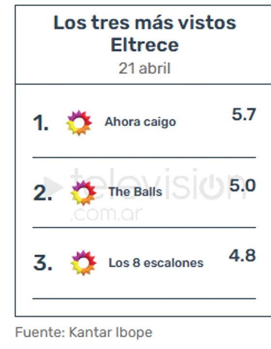 Tres programas, pero solo dos conductores, se quedaron con todo el podio de audiencia del canal del solcito. Ahora Caigo, con un promedio de 5.7 puntos de rating, volvió a ser lo más visto, una constante desde que el ciclo de Darío Barassi irrumpió en el Prime Time de la emisora.