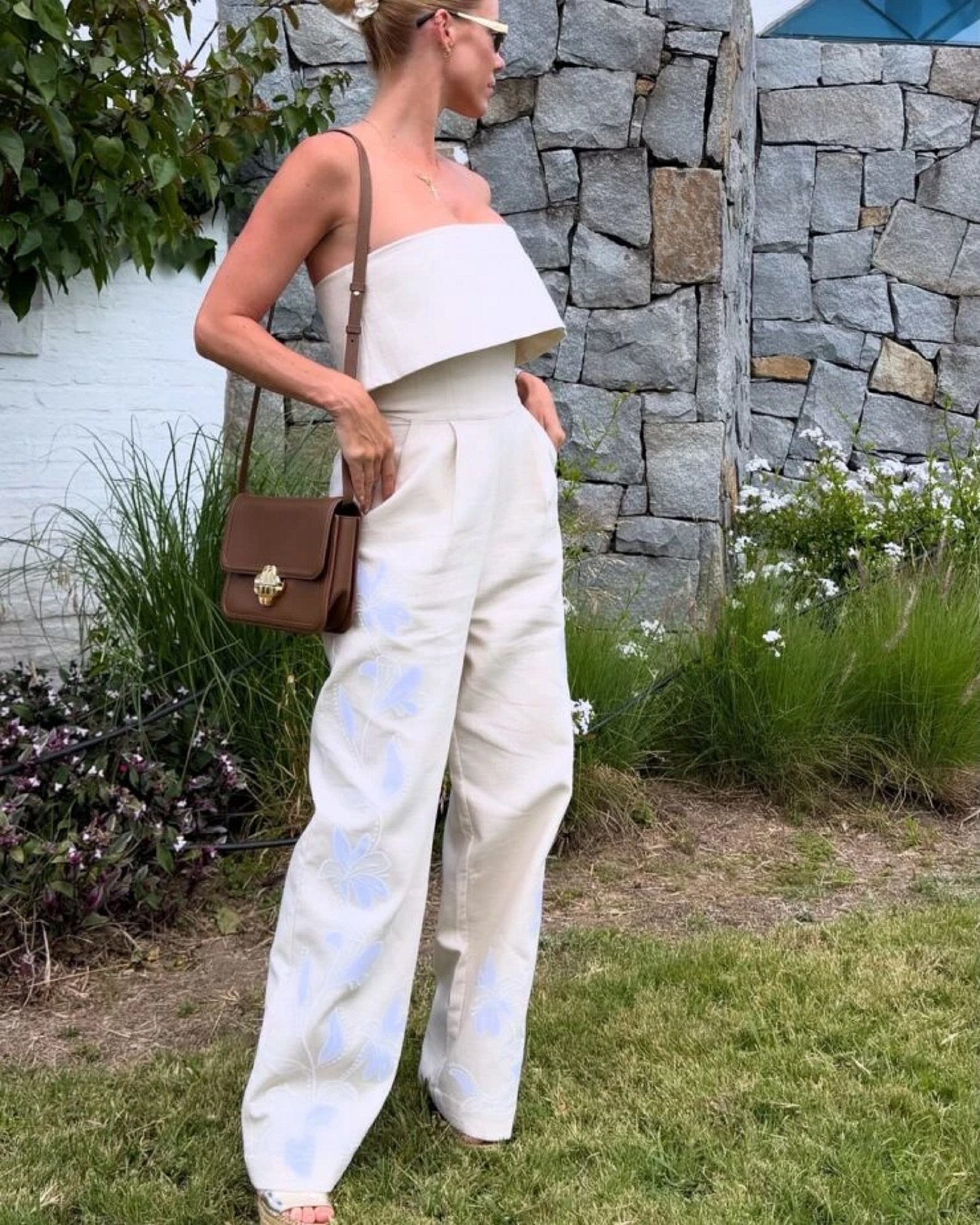 Para el evento, Nicole Neumann eligió un mono de pantalón wide leg, con sutiles flores bordadas en blanco, y top en color crudo con volados, con sandalias de plataforma de yute al tono y cartera bandolera en cuero marrón.