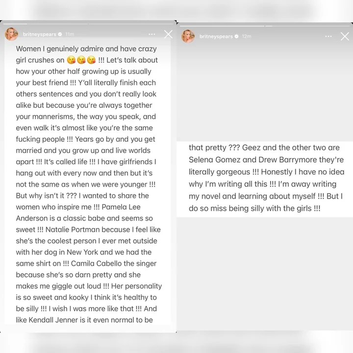 Seguido a esto, Britney comienza nombrando a las mujeres del mundo del espectáculo que “admira” y que tiene “girl crushes”.