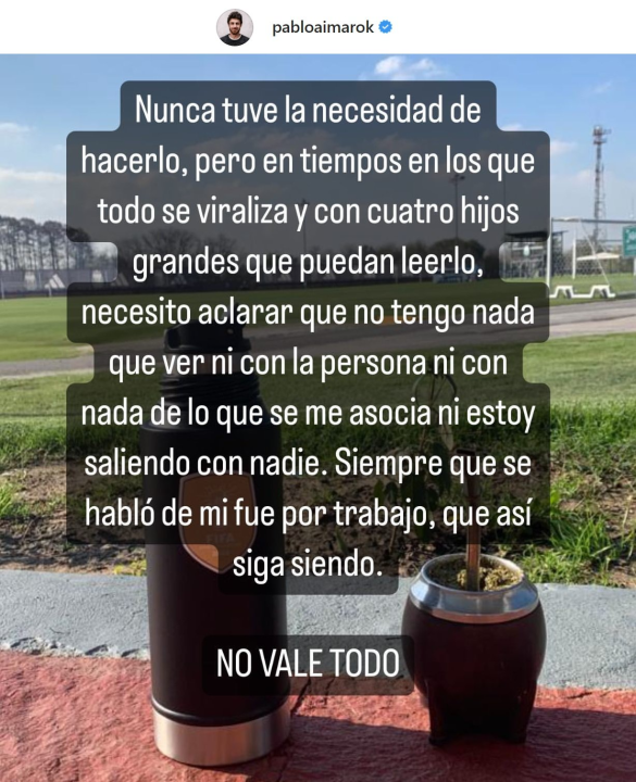 Ante las repercusiones, el propio Pablo Aimar salió a aclarar la situación. «Nunca tuve la necesidad de hacerlo pero en tiempos en los que todo se viraliza y con cuatro hijos grandes que pueden leerlo, necesito aclarar que no tengo nada que ver ni con la persona ni con nada de lo que se me asocia ni estoy saliendo con nadie», señaló Aimar en su cuenta de Instagram.
