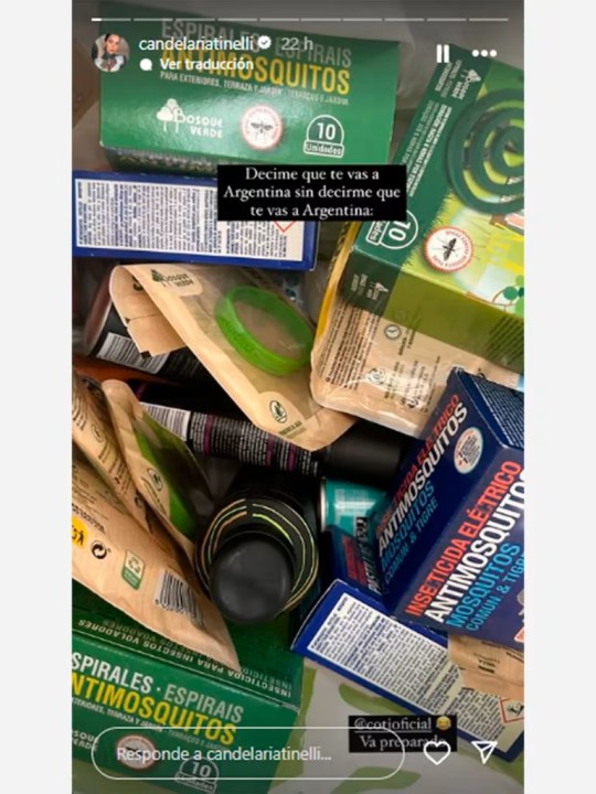 Su esposa Lelé, mostró a través de sus historias de Instagram, el cargamento de repelente, pastillas, espirales y pulseras con olor para espantar a los mosquitos que Sorokin preparó para llevarse a Buenos Aires.“Decime que te vas a Argentina sin decirme que te vas a Argentina”, escribió de forma irónica junto a la foto de los productos y sumó: “Coti va preparado”.