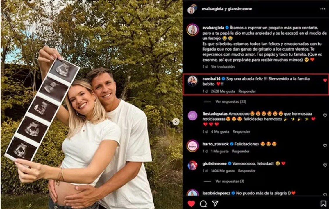 La noticia fue recibida con alegría por todo el entorno del futbolista, especialmente por su madre, Carolina Baldini, quien no tardó en expresarlo públicamente. “¡Soy una abuela feliz! Bienvenido, bebito”, comentó en el posteo de Eva, acompañando el mensaje con emojis de ternura. La exmodelo y exesposa de Diego Simeone vive actualmente en España para estar cerca de sus hijos y acompañar sus carreras deportivas.
