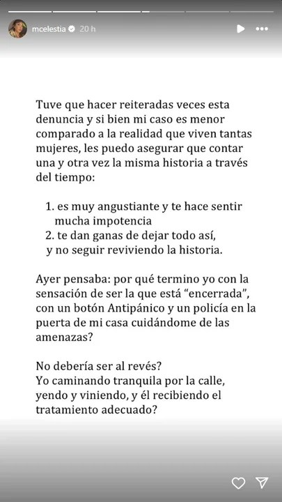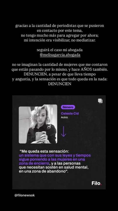 La reconocida actriz Celeste Cid revolucionó las redes sociales tras hacer pública una denuncia por acoso. Según detalló en sus historias de Instragram, un hombre le envía mensajes amenazantes, fotos y videos desde que ella tenía 15 años.