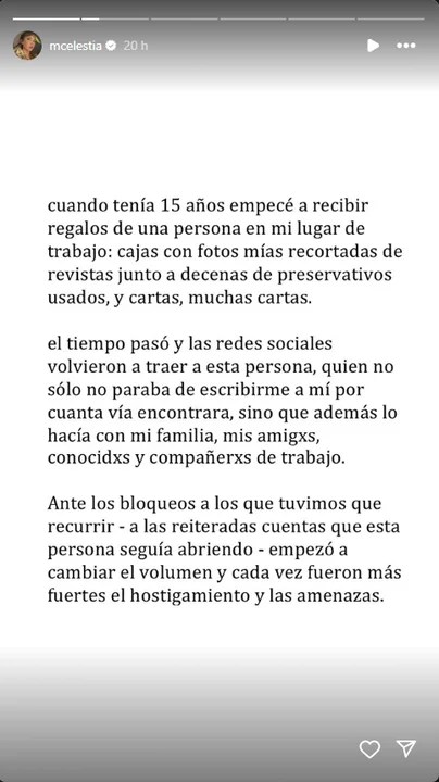 “Cuando tenía 15 años empecé a recibir regalos de una persona en mi lugar de trabajo: cajas con fotos mías recortadas de revistas junto a decenas de preservativos usados, y cartas, muchas cartas. El tiempo pasó y las redes sociales volvieron a traer a esta persona, quien no sólo no paraba de escribirme a mí por cuanta vía encontrara, sino que además lo hacía con mi familia, mis amigxs, conocidos y compañerxs de trabajo”, contó.