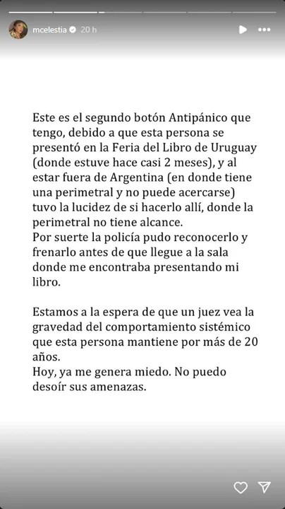 «Este es el segundo botón Antipánico que tengo, debido a que esta persona se presentó en la Feria del Libro de Uruguay (donde estuve hace casi 2 meses), y al estar fuera de Argentina (en donde tiene una perimetral y no puede acercarse) tuvo la lucidez de si hacerlo allí, donde la perimetral no tiene alcance”, explicó.